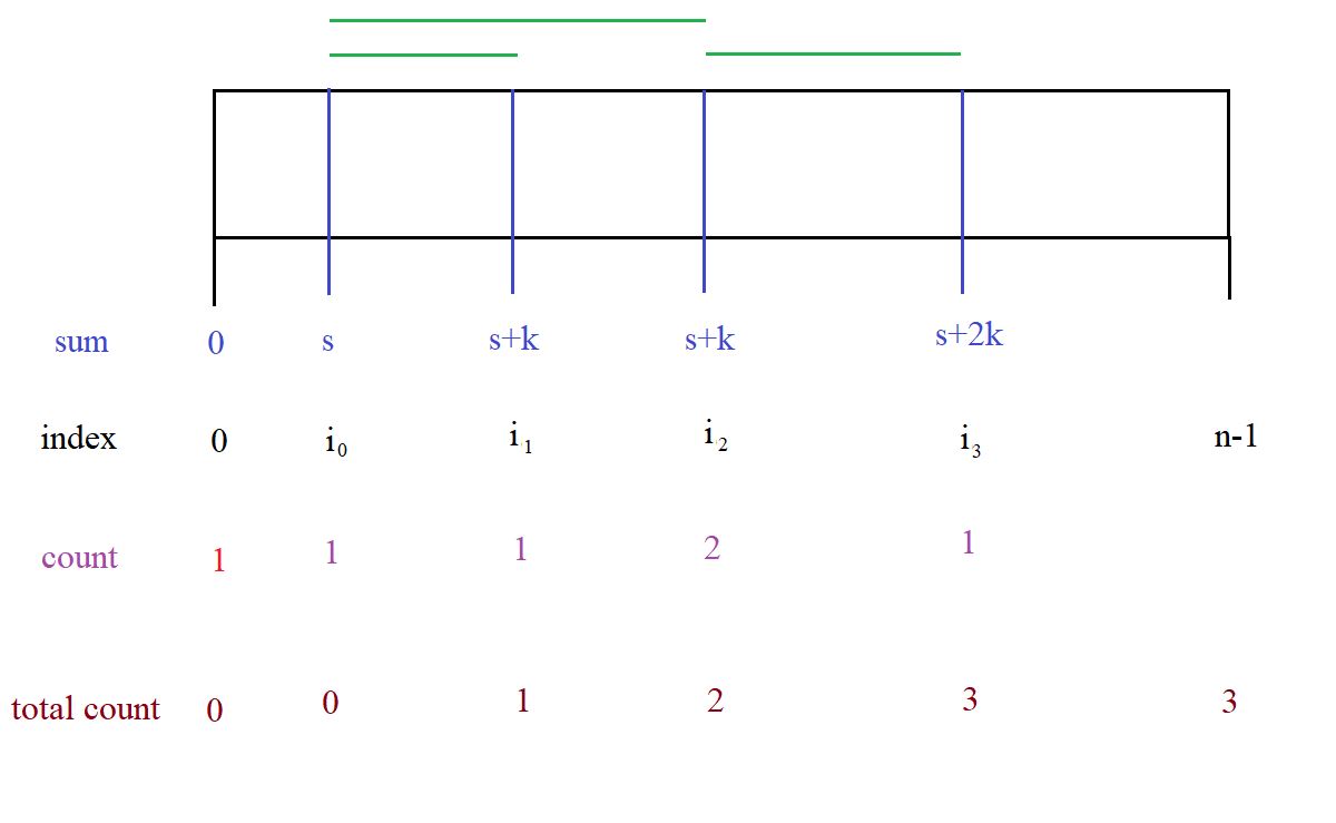 이를 일반화 해보면, 임의의 두 인덱스 사이의 구간 (i, j] 의 부분 배열의 합이 \( k \) 가 될때, \( (i, j] \) 내의 합이 0이 되는 부분 배열 갯수만큼 합이 \( k \) 가 되는 부분 배열의 총 갯수가 더해지는 것을 알 수 있습니다.