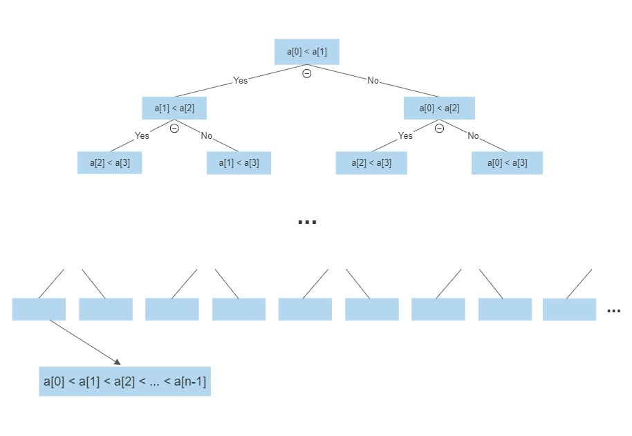 예를 들어, A = [3, 7, 2, 4] 의 배열이 있다 가정할 때, 어떤 방법으로 비교할 두 원소 7 과 2를 선택한 경우, 이 두 원소의 상대적인 순서에 대해 2가지 결정을 할 수 있습니다. 7 2 순으로 나열하거나 혹은 2 7 순서로 나열하는거죠. 다시 말해, A 내의 임의의 두 원소 (element) a, b 에 대해 매번 정확히 2가지의 경우의 수가 주어집니다: a b 혹은 b a 순으로 정렬하는거죠. 이 때, 이 경우의 수를 가지고 내릴 수 있는 의사 결정을 트리 (Tree) 형태로 표현할 수 있고, 이를 Decision Tree 라고 합니다.